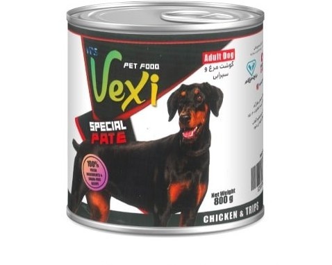 کنسرو سگ وکسی Vexi با طعم مرغ و سیرابی مدل پته وزن 800 گرم